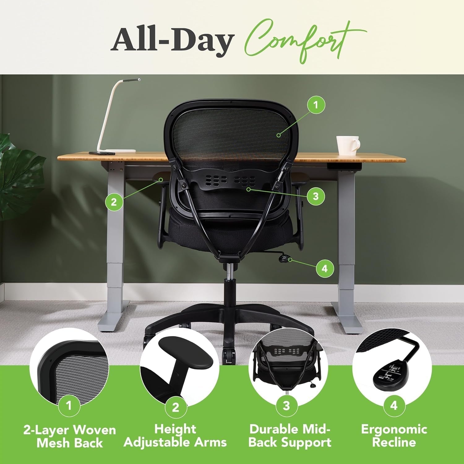 - Adjustable-height arms to customize support for your neck and shoulders and fit your desk height.