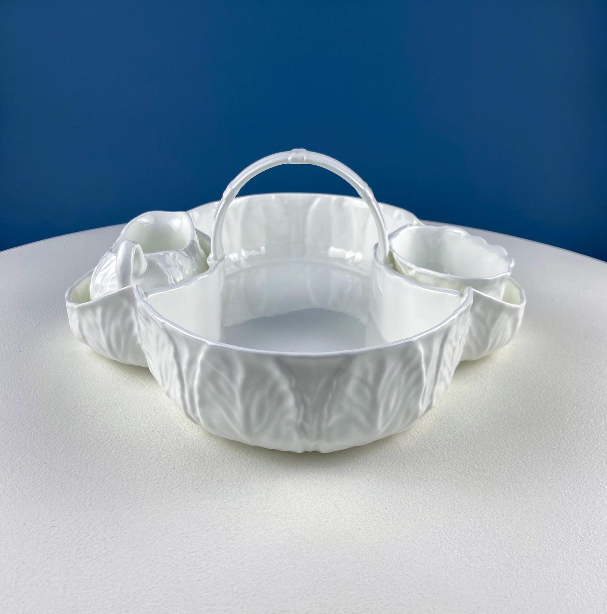Rare Vintage Wedgwood Countryware Porcelain Basket for Serving Strawberries, Cream, & Sugar. Set of 3 White Dishes. 3-D Leaf Texture. Perfect for Garden Party. Romantic Gift for Him Her. Dining Room Table Decor. Modern Country. Excellent Condition. Marked by the Manufacturer.