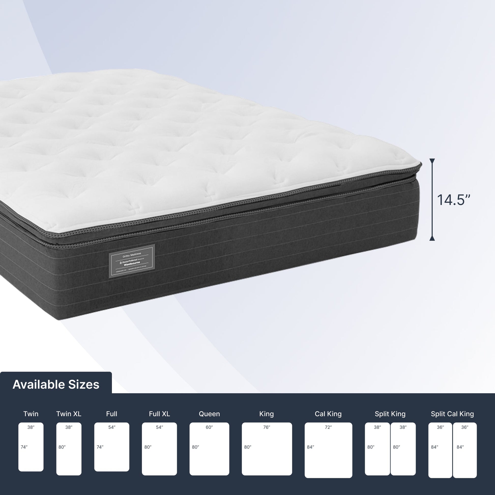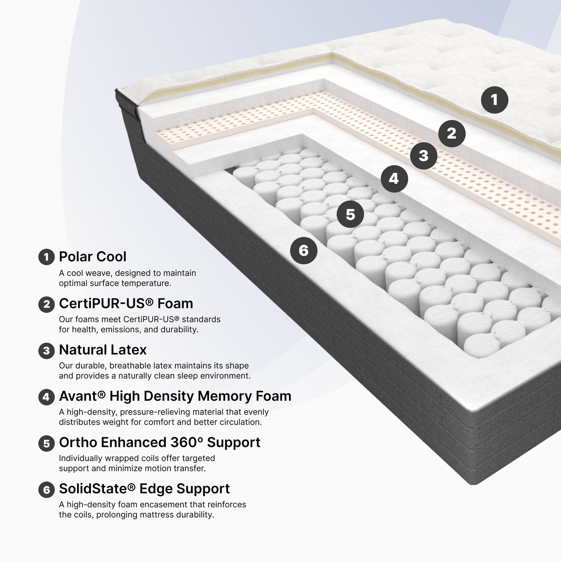 The Westbourne Pillow Top provides a soft and cozy feel while maintaining a high level of support. The Enhanced 360° Support coil structure, Latex Foam comfort layer, and Polar Cool cooling material makes a complete sleep system.