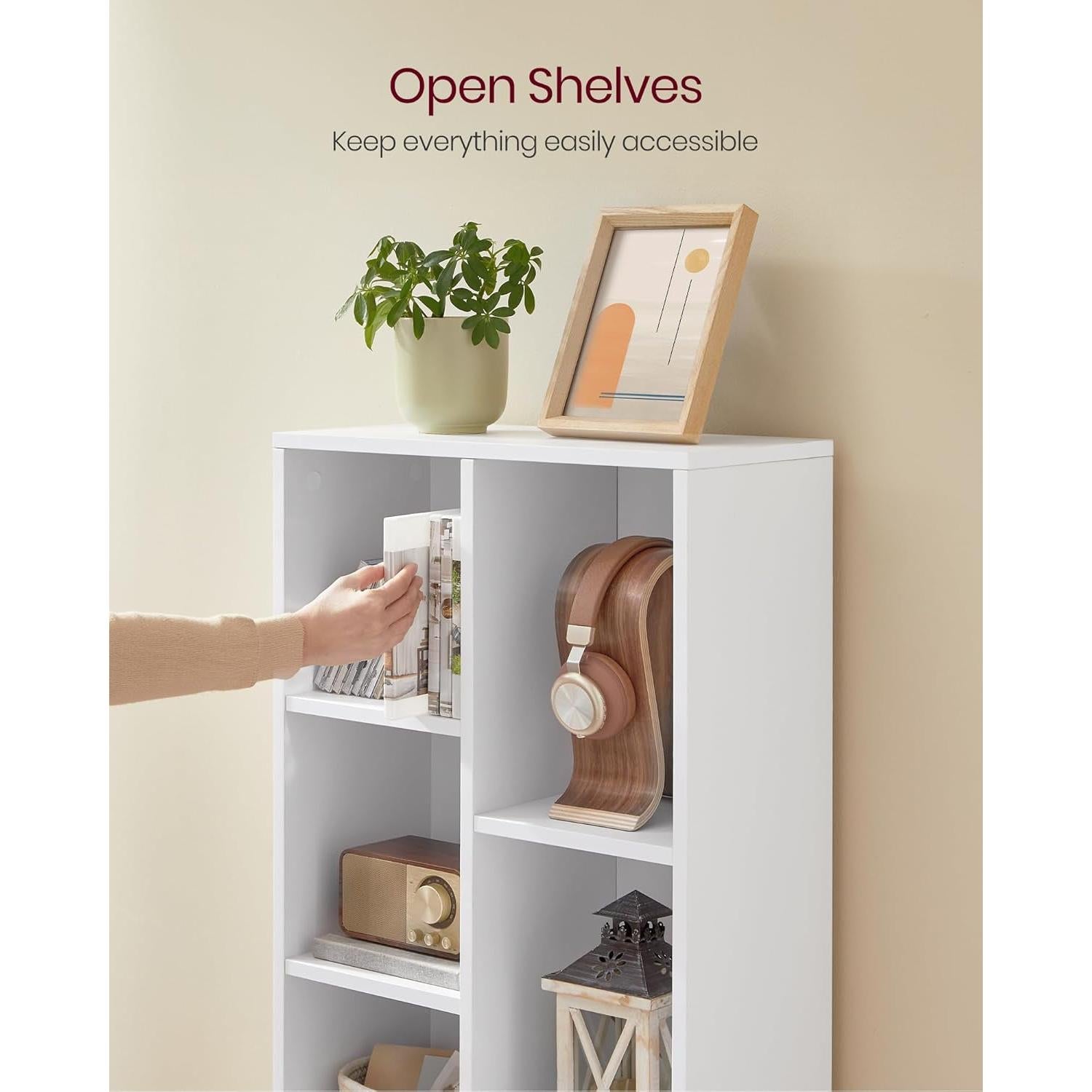 - 7 open compartments with 3 large and 4 small sections and varied heights to perfectly display books, photos, plants, and collectibles.