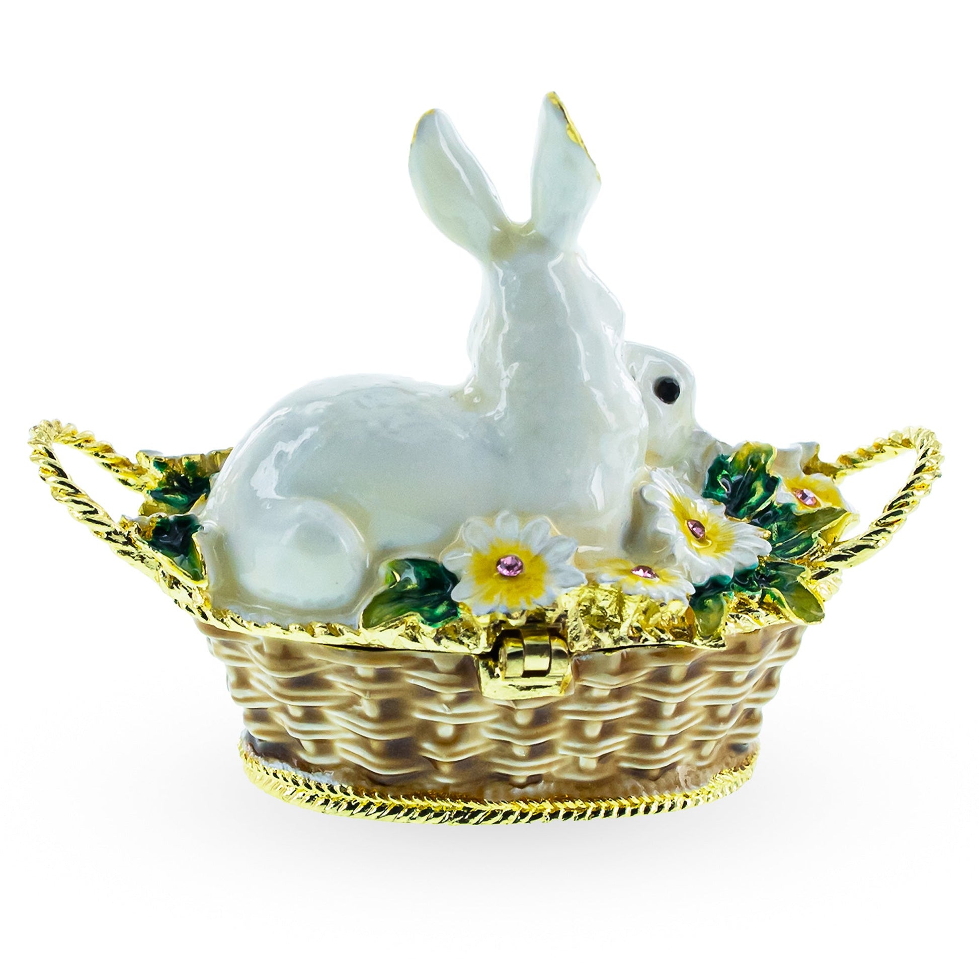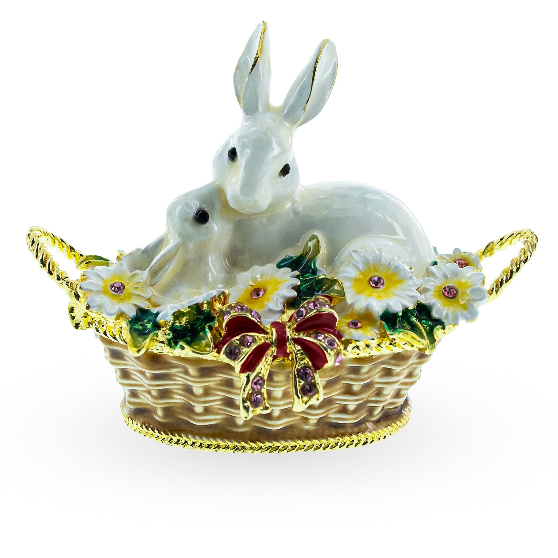 White Bunny Family in Easter Basket Trinket Box Figurine 2.5 Inches