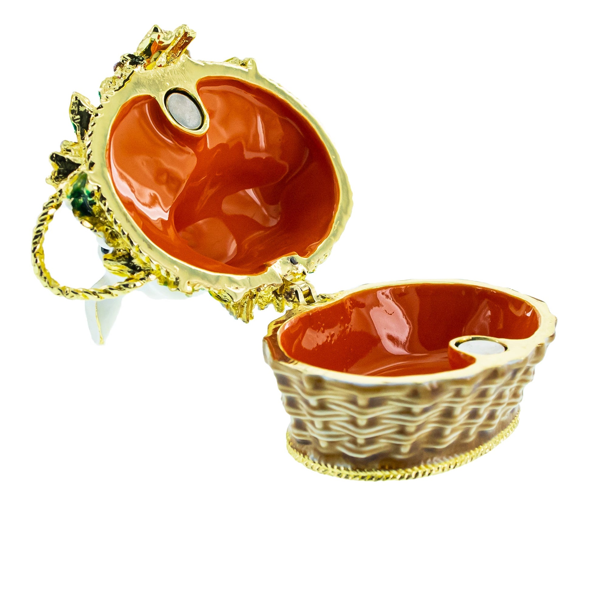 This hand painted sparkling bunny family figurine is adorned with clear crystals and high-polished enamel with golden trim. The figurine opens on a hinge and closes shut with a magnet, to keep the box securely shut. The piece comes in a beautiful gift box.