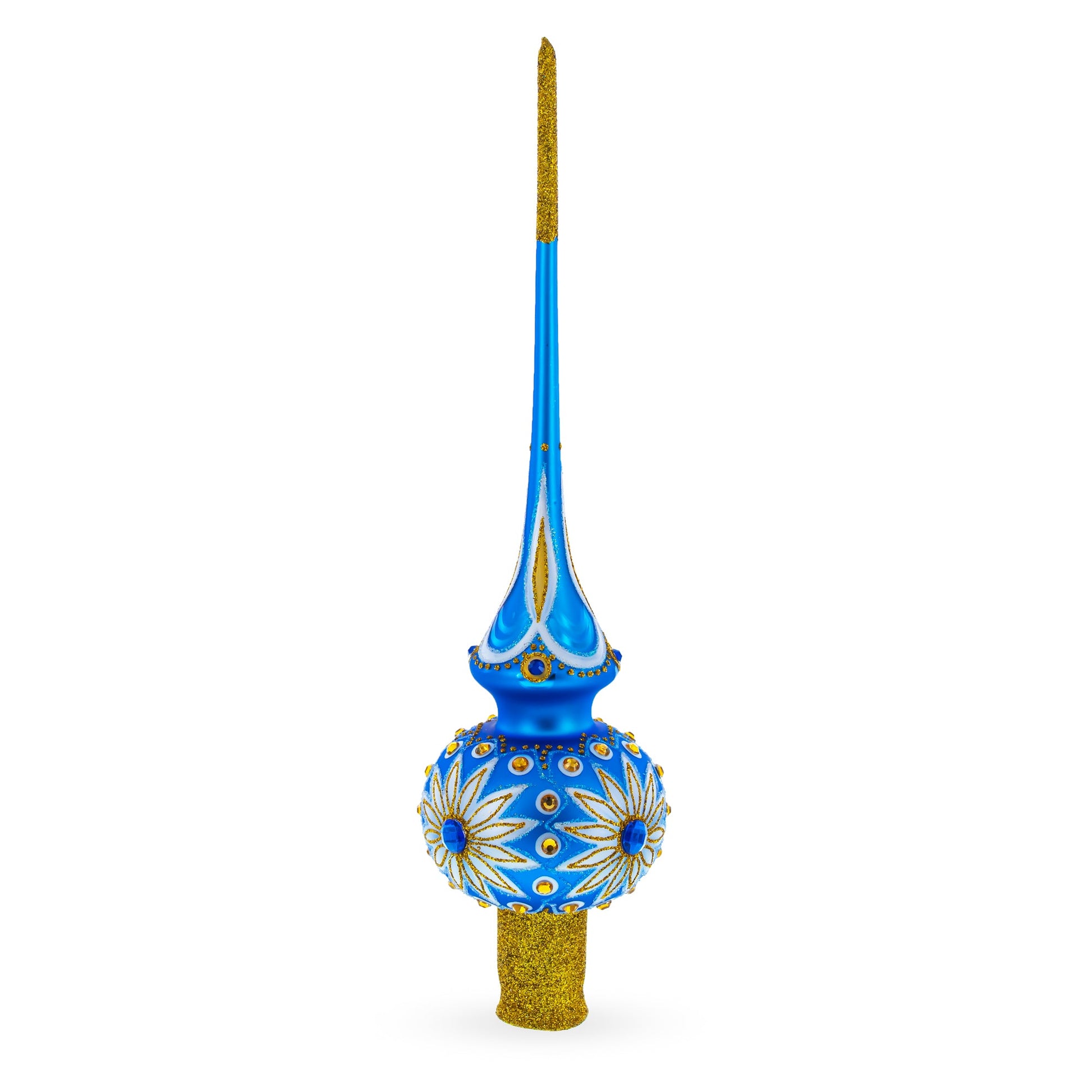 White Daisies on Blue Glass Christmas Tree Topper 11 Inches