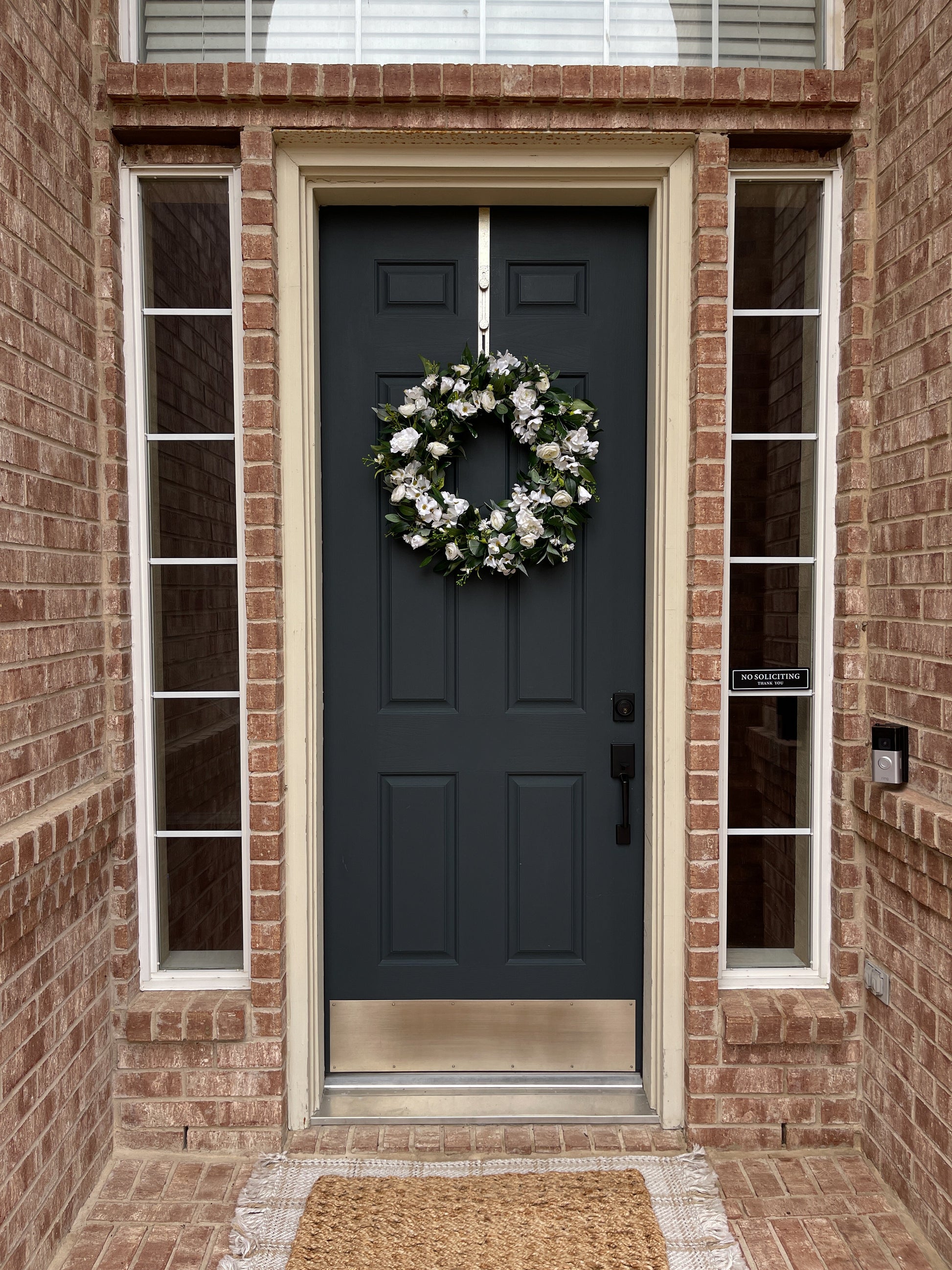 Brighten your front door with this stunning white and green wreath, perfect for the summer season! This high-end, artificial wreath has been handcrafted on a grapevine base and is filled with dogwood blossoms, ranunculus, and lisianthus and accented with mini floral sprays and green berries. Florals are nestled in various greenery, including osmanthus, pittosporum, and eucalyptus. This summer wreath is also perfect indoors - hanging this wreath over a mantle or mirror will create a striking design statement. The wreath comes ready to hang using the attached jute twine loop.