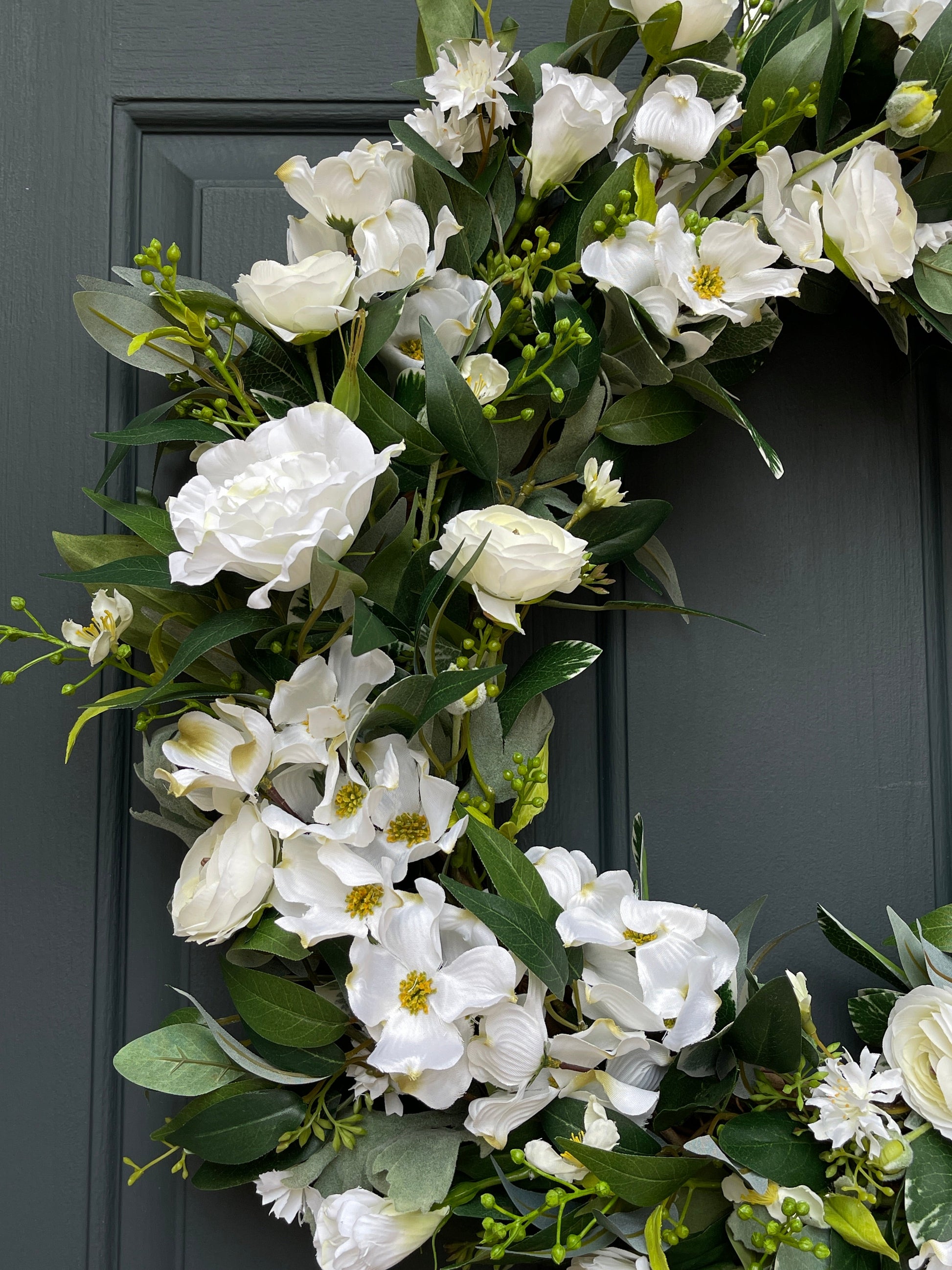 White & Green Dogwood, Ranunculus, and Eucalyptus Wreath