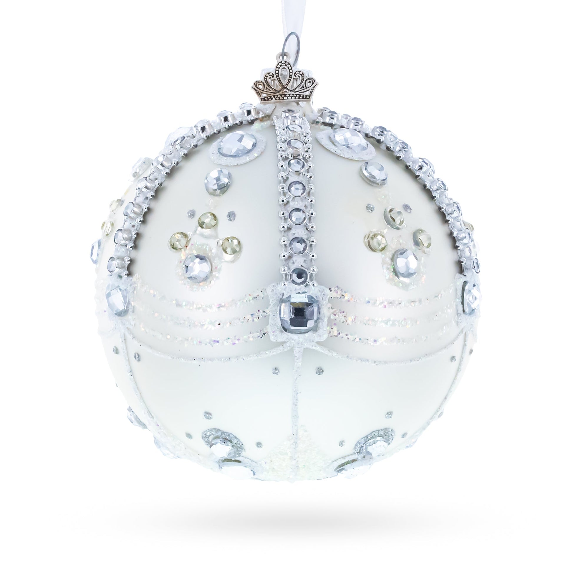 White Jewels on Silver Glass Ball Christmas Ornament 4 Inches