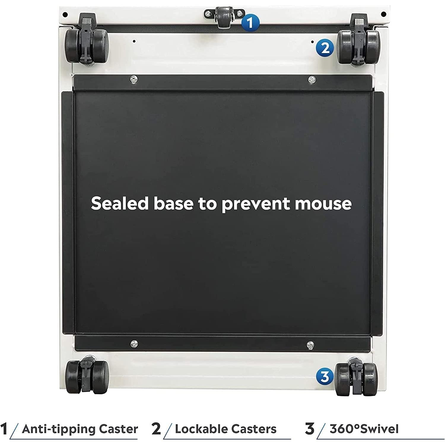 - Easy mobility rolling cabinet with 2 front braking casters and 1 center caster to prevent tipping, designed to roll across your floor with ease.