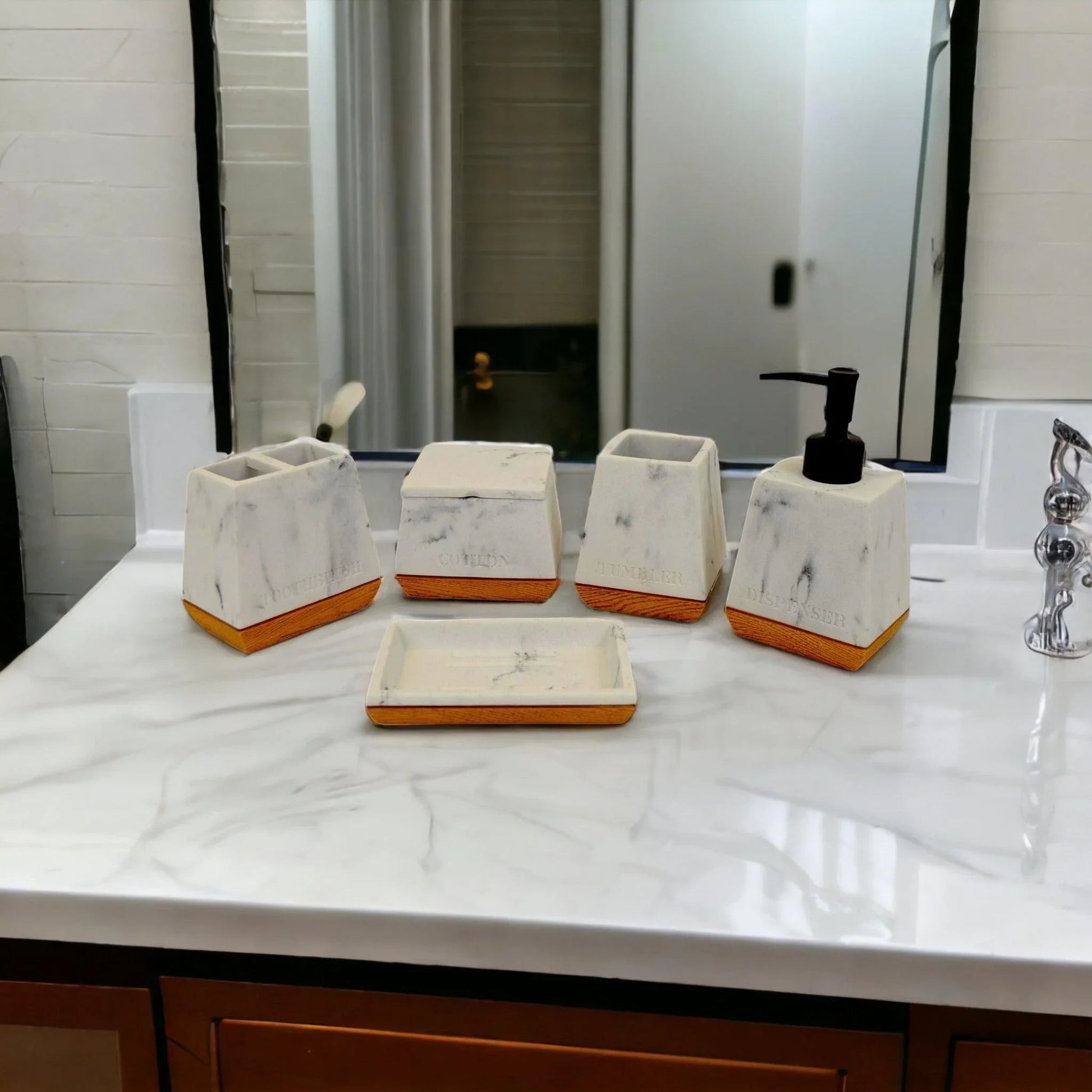 Wrapped in a lustrous white marble finish and a sturdy wood foundation, this magnificent bath set will elevate the atmosphere of any residential or commercial area, imbuing it with grandeur and wonder. A timeless design that makes any bath a palace, its beauty and style infusing classic elegance into the modern world.