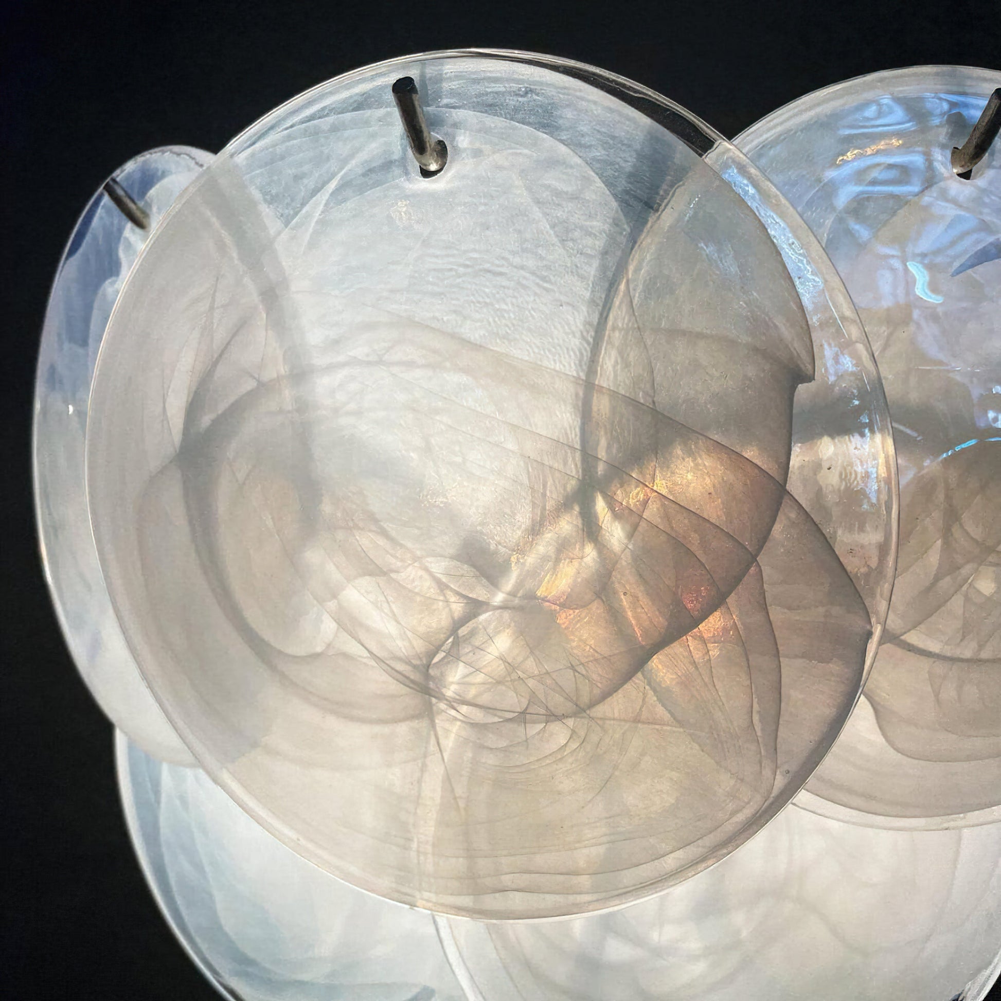 Indulge in the luxurious charm of the White Vintage Murano Glass Wall Lamp, adorned with dazzling white glass discs for each wall light. These discs possess a striking quality of reflecting a multitude of colors, transforming any room into a mesmerizing and radiant masterpiece. Elevate your space with this captivating and luminous lamp.