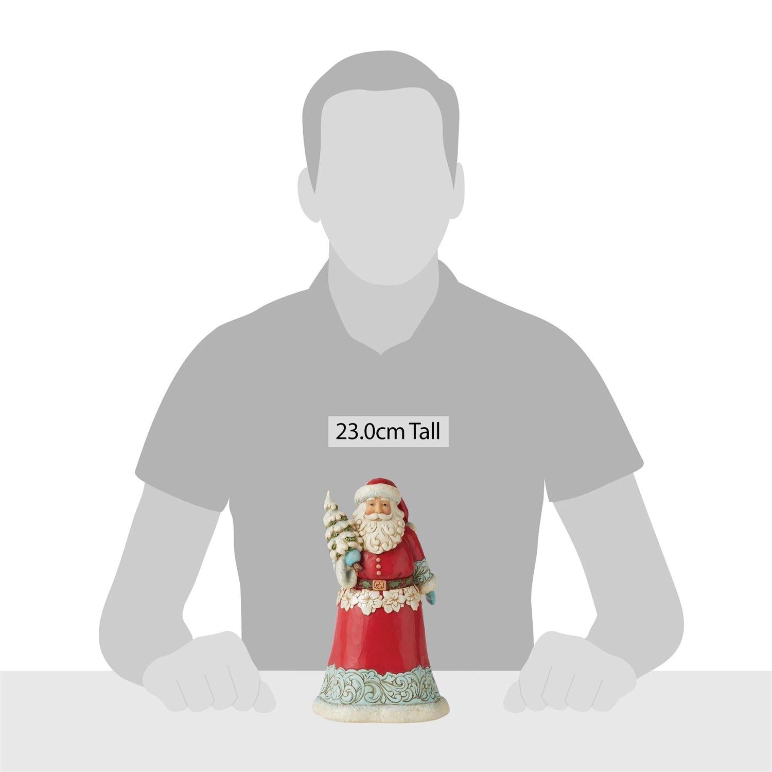 This Winter Wonderland Santa statuette wears an intricate rosemaled cloak brimmed in white poinsettias and holly patterned belt. With a beard full of curls and rosy cheeks, Santa giddily carries a snow glistened tree in his hand for your home.