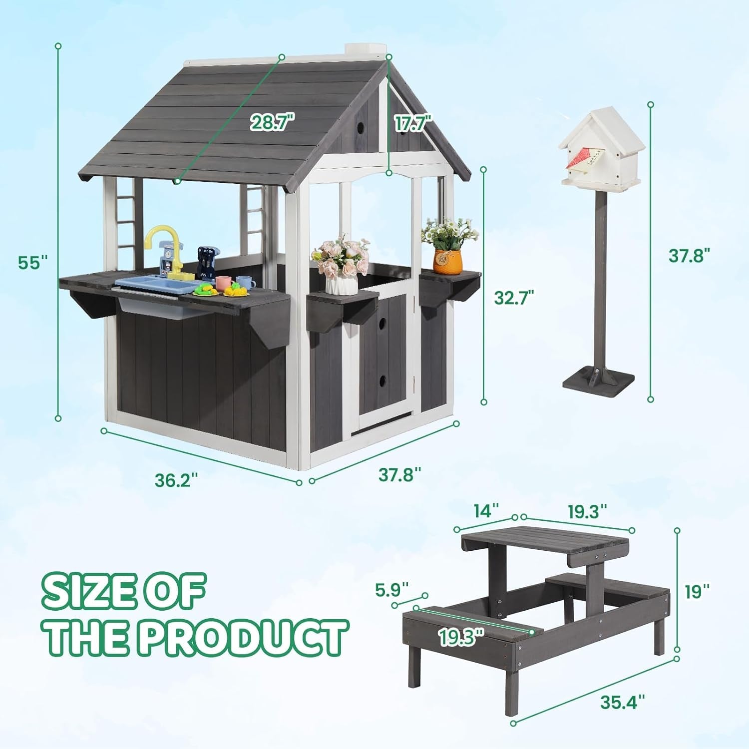 - All-in-one playset: wooden children's house, a play-kitchen sink toy with a built-in reservoir, a picnic table and chair set, and a wooden mailbox—designed to fuel rich role-play and outdoor games.