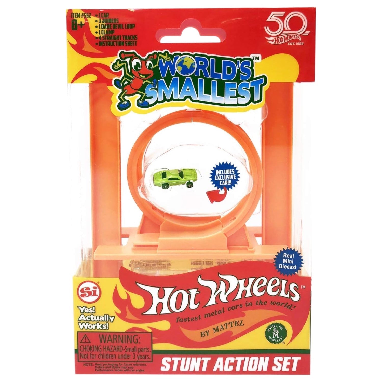 Defy gravity with the world famous World's Smallest Stunt Action Loop set, featuring the most recognizable Hot Wheels track anywhere! This mini world stunt action set actually works!! Set up the tracks for the best incline, to generate enough speed to make it around the loop. Challenge your friends and see who can master the course. Made for use with World's Smallest Hot Wheels cars, this set include one World's Smallest Hot Wheels exclusive car (car color & style may vary), 3 track joiners, 1 dare devil loop, 1 clamp, 4 straight tracks and instruction sheet. Interconnects with all World's Smallest Hot Wheels sets to combine, build and race! Some assembly required. Due to small parts, this is not recommended for children under 6 yrs. Recommended age 8+.